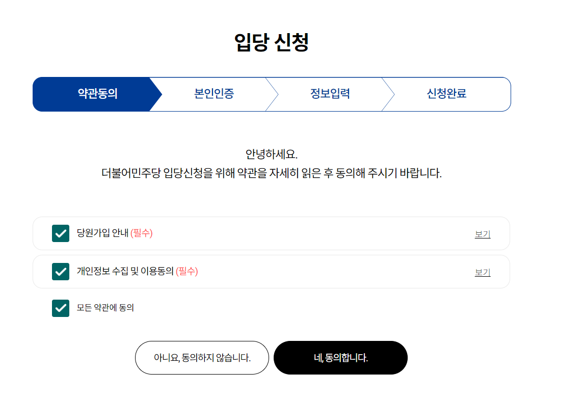 - ‘입당 신청’ 클릭 후, 약관 동의 및 본인 인증 진행